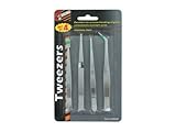 Tweezers are excellent for precise handling of parts, components and light wires. Each pack comes with 4 different styles of tweezers. Come packaged on a blister card with hanging hole. Measurements: 4 1/4" long paddle grip file, 4 1/2" long crossover pointed style file, 4 1/2" long angle head file with a 1/4" angle and 4 1/2" long regular style tweezer. Colors: silver; Materials: metal